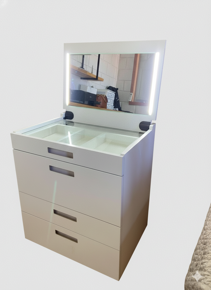 Como penteadeira, ele oferece espaço ideal para seus cuidados diários, com tampo amplo e compartimentos para maquiagens e acessórios.